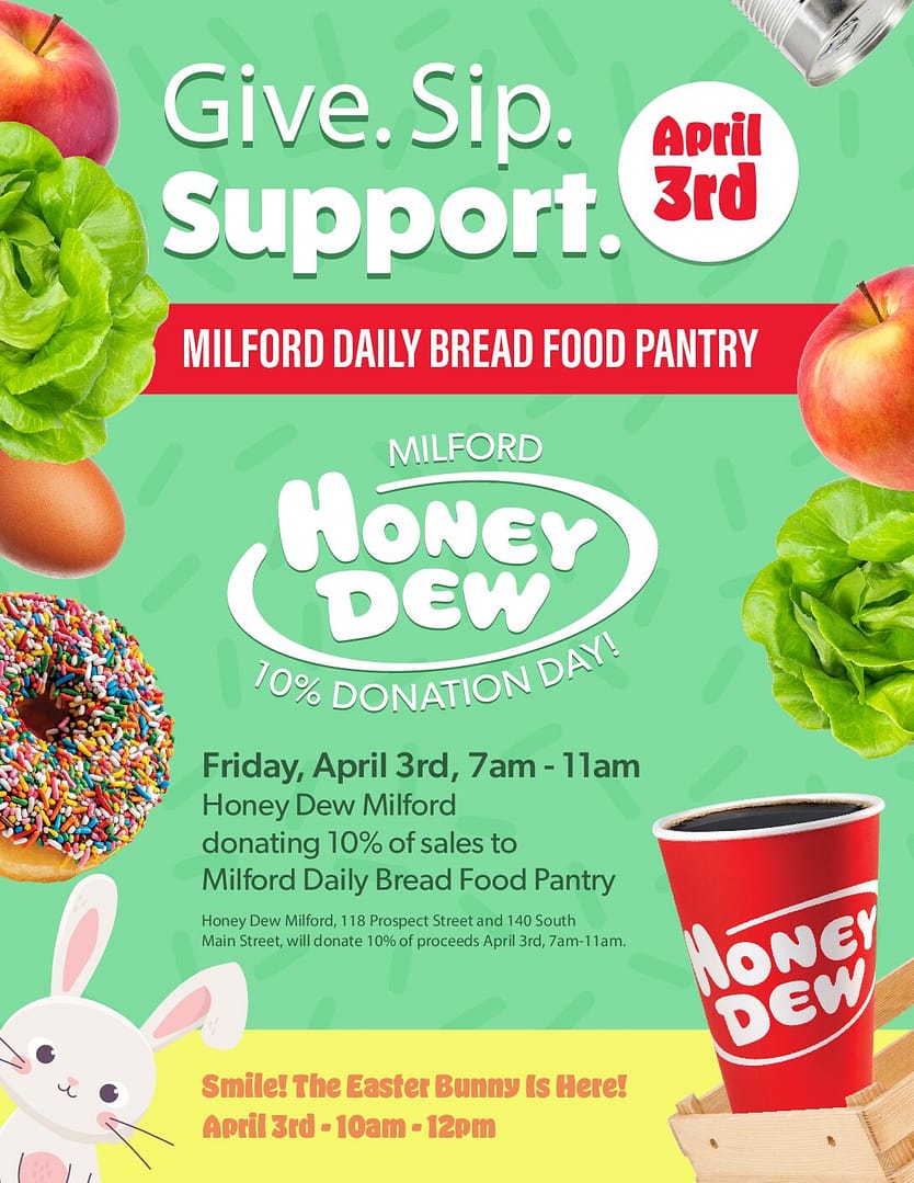 Please HOP IN for a delicious coffee and a treat at Honey Dew, where 10% of the sales go to supporting the pantry.